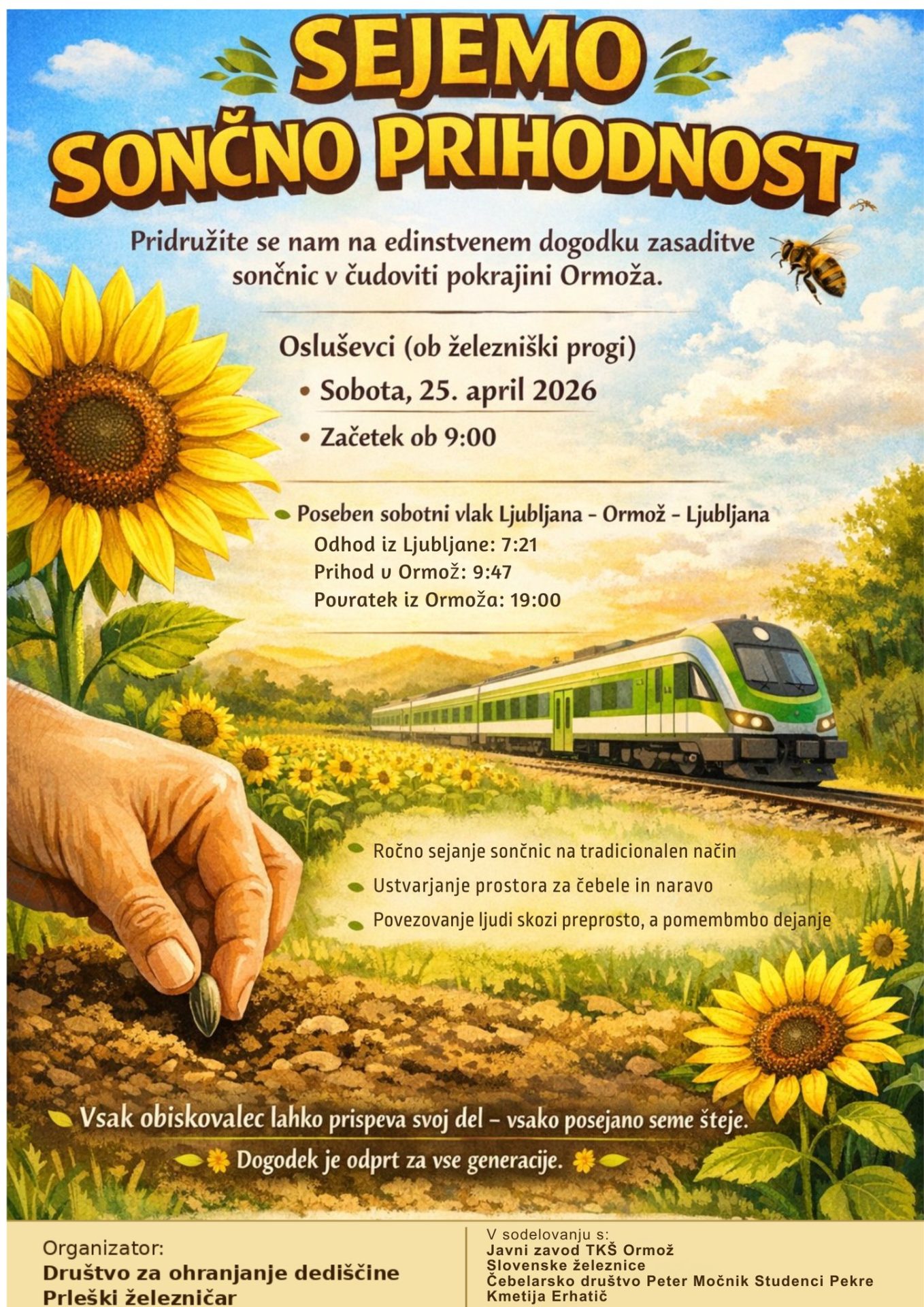 Glede na poseben vlak, ki bo ob sobotah ( 20 krat v sezoni) ob 7.21 minut krenil iz Ljubljane in v Ormož prispel ob 9.47 minut, nazaj proti Ljubljani pa se vračal ob 19.uri, so tako lanski pogovori med županom in predstavniki Slovenskih železnic bili uspešni! Kot je v nadaljevanju uradnega dela srečanja med drugim povedal župan Danijel Vrbnjak bo občina poskrbela tudi za avtobus, ki bo potnike pričakal na železniški postaji v Ormožu in jih zapeljal po Destinaciji Jeruzalem Slovenija in nazaj na odhod vlaka. Vse v želji, da naš konec Slovenije obišče čim več turistov. Častni predsednik Društva Prleški železničar mag. Franci Zemljič pa je dodal, da bo uradna izvedba sejanja sončnic ob železniških progah po Sloveniji 13.junija in zbrane povabil tudi na ta dogodek. Slovenske železnice namreč projekt »Sejemo sončno prihodnost« nadaljujejo tudi letos. V soboto ob prihodu prvega posebnega oziroma turističnega vlaka pa so jih zasejali simbolno.